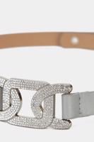 Genişlik:2 cm uzunluk :75 cm orta delik S beden ölçüsü Taşlı zincir detaylı arkadan çıtçıt kapamalı kemer %100 poliüretan üst malzeme, alt malzeme %50 deri %50 poliüretan Aksesuar genişligi:7 cm