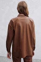 Anja gömlek ile içinizdeki asi ruhu uyandırmaya ne dersiniz? Kışkırtıcı zımba detayları, düşük kollu kalıbı ve deri görünümlü kumaşı ile tarzınızın dışına çıkmak istediğiniz anlarda Anja gömlek modelinin çekiciliğinden yararlanabilirsiniz. İster içine beyaz bir crop top giyerek, ister tek başına kullanabileceğiniz bu deri gömlek, sonbahar koleksiyonunuzda bir yıldız gibi parlamaya hazır.
