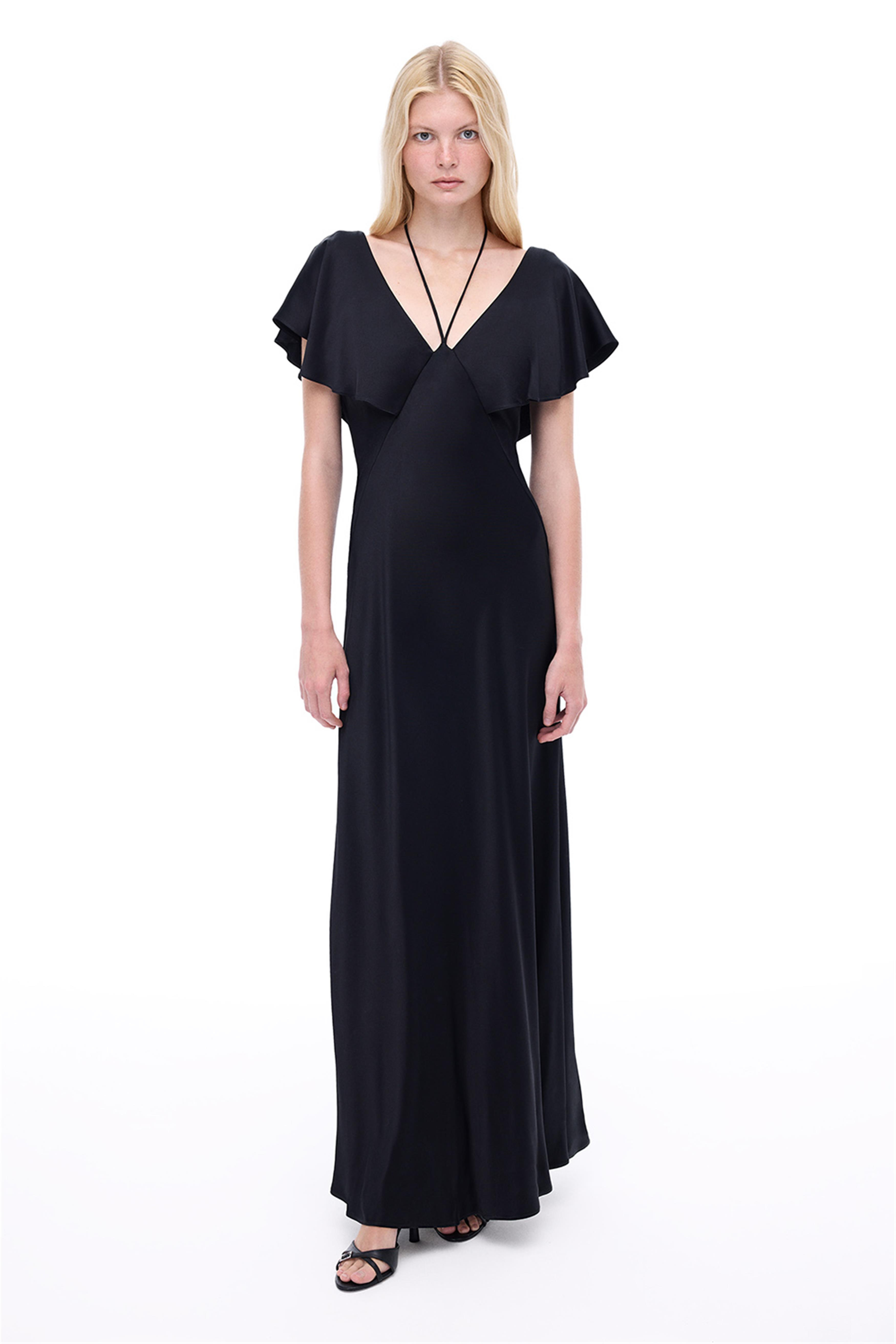 Pandoras Regular Fit Bilek Boy Sıfır Kol V-Yaka Siyah Elbise