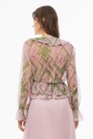 Albanis Regular Fit Geometrik Desenli Standart Boy Takma Kol V-Yaka Pembe Renk Kadın Bluz