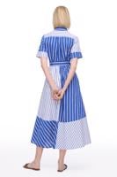 Doğal pamuk ve dayanıklı poliamid karışımı kumaştan üretilen çizgili uzun elbise, hafifliği ve nefes alabilir yapısıyla öne çıkar. Kısa kollu ve regular fit kesimiyle rahat bir duruş sunarken, ön düğme detayı klasik şıklığı tamamlar. Günlük kombinlerde ya da yaz davetlerinde rahatlıkla tercih edebileceğiniz modern ve zarif bir tasarımdır.