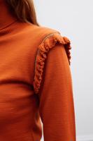 Melies triko bluz ile dolabınızda canlılığa ve harekete yer açın! İç açıcı renklerle omuz kısmındaki feminen fırfır detaylarının bir araya gelmesi ile hayat bulan Melies boğazlı triko kazak, yün karışımlı, üstün kaliteli kumaşı sayesinde sizi sıcacık tutuyor. Melies triko bluz ile siz de balıkçı yakanın cazibesine kapılmaya hazır olun!